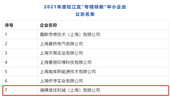 《松江區(qū)“專精特新”中小企業(yè)發(fā)展專項支持實施細則(2020年版)》(滬松經(jīng)〔2020〕165號),區(qū)經(jīng)委組織開展了2021年度松江區(qū)“專精特新”中小企業(yè)申報和復核工作。涌鎮(zhèn)液壓充分發(fā)揮自身優(yōu)勢,堅持獨立自主的研發(fā)與創(chuàng)新設計,憑借高效的產(chǎn)品創(chuàng)新能力和廣泛的市場認可度,成功申報并獲得上海市松江區(qū)“專精特新”的稱號。